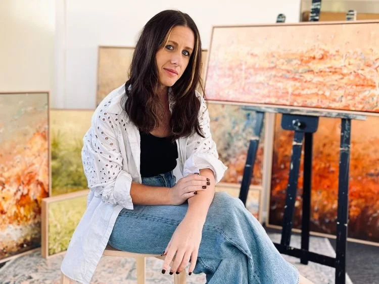 As a contemporary abstract landscape artist, Emma’s work is defined by a unique colour palette, featuring rich earthy tones, burnt oranges, ochres, deep reds, and rust. The consistency of these tones has become a signature element in her work, reinforcing Emma’s connection to the land.