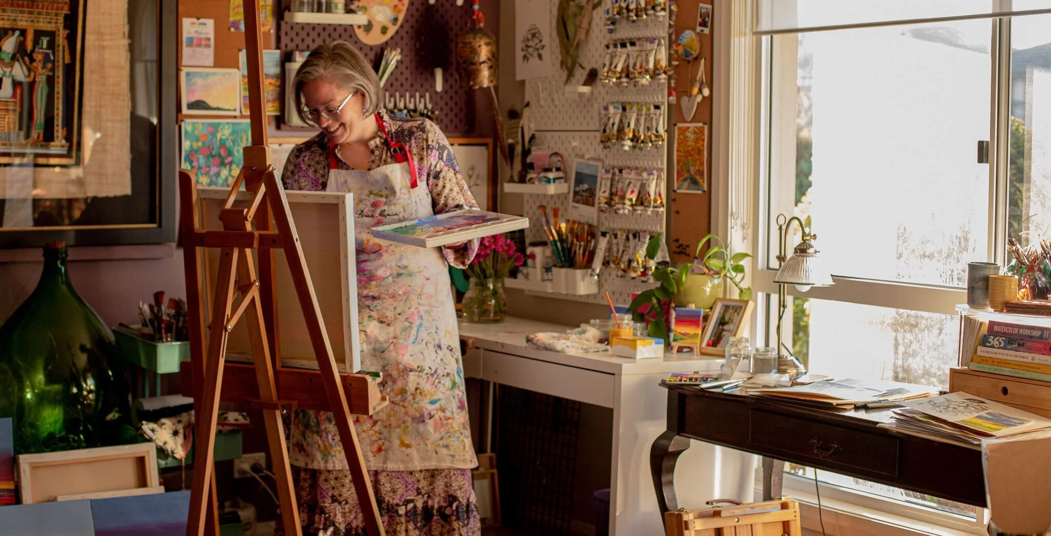 Her painting journey began as a search for a creative outlet after becoming a mother, leading her to fall in love with the medium.